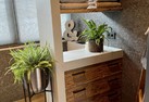 Op de derde foto kunt u ons bijpassende kastontwerp zien, dat perfect samengaat met het 'Fleur' badmeubel. Dit stelt u in staat om een harmonieus en samenhangend ontwerp in uw badkamer te creëren. Ook bieden we wandplanken aan van dezelfde houtsoort of een leuke plank voor op het bad. Een mooie zuil met een plant er op kunnen we ook leveren.