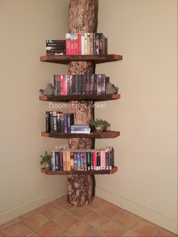 Deze kast is gemaakt van boomstam en planken. Op de foto's zijn de planken van steigerhout en beukenhout gemaakt, maar dit kan uiteraard ook met eikenhouten planken gemaakt worden. Deze planken zijn 5 cm dik.