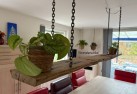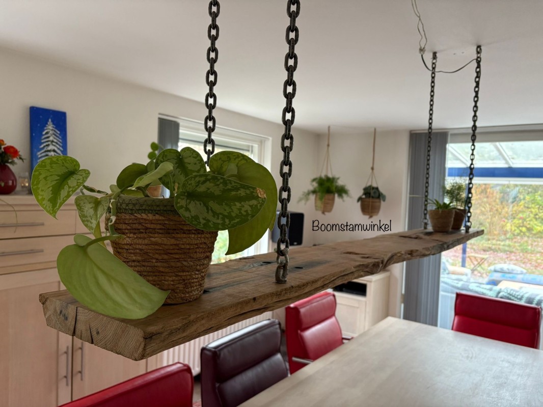 In de plank zit een ledstrip gemonteerd. Ook mogelijk met een dimbare ledspots. Kijk hiervoor bij 'hanglamp Praal'. Het verschil tussen een hanglamp met een ledstrip en een hanglamp met spots zit in de lichtopbrengst. De hanglamp met ledstrip geeft meer licht! Ook kan deze verder terug dimmen dan een hanglamp met spotjes. Verder heeft deze lamp als voordeel dat de bovenkant van de plank helemaal vlak is. Bij de hanglamp met de spots zit bovenop de lamp een houten latje. Dit is nodig om de spots te kunnen monteren. We maken deze mooie houten hanglamp tot een lengte van maar liefst 5 meter! Super gaaf met plantjes er op!