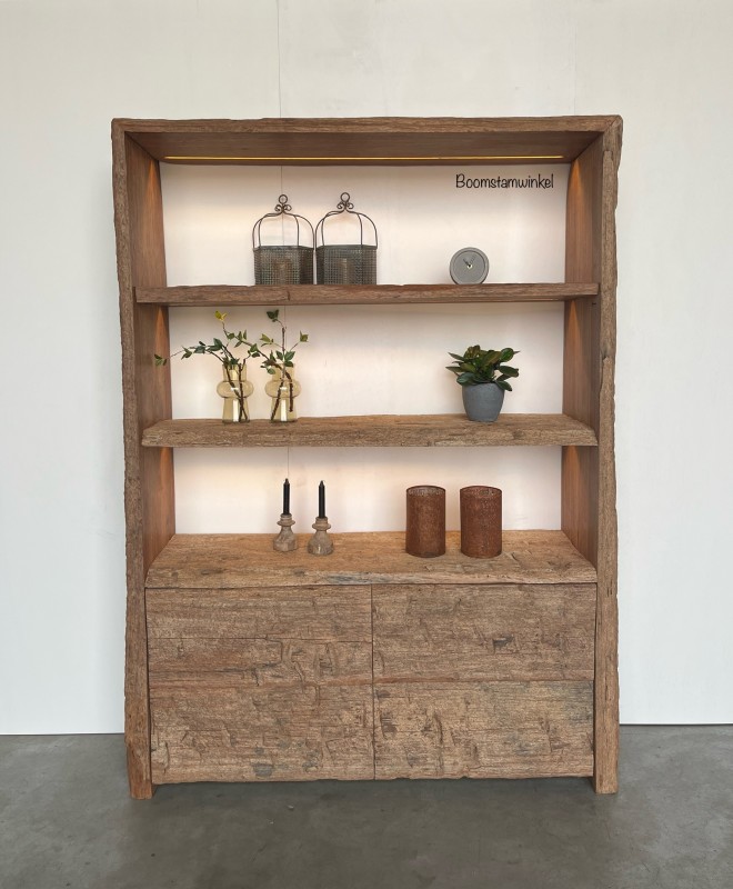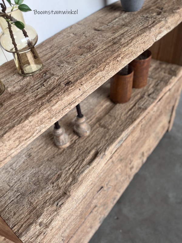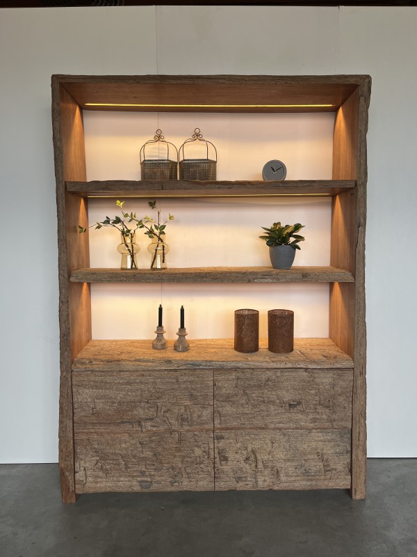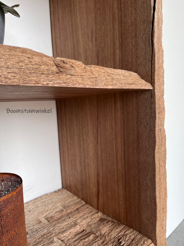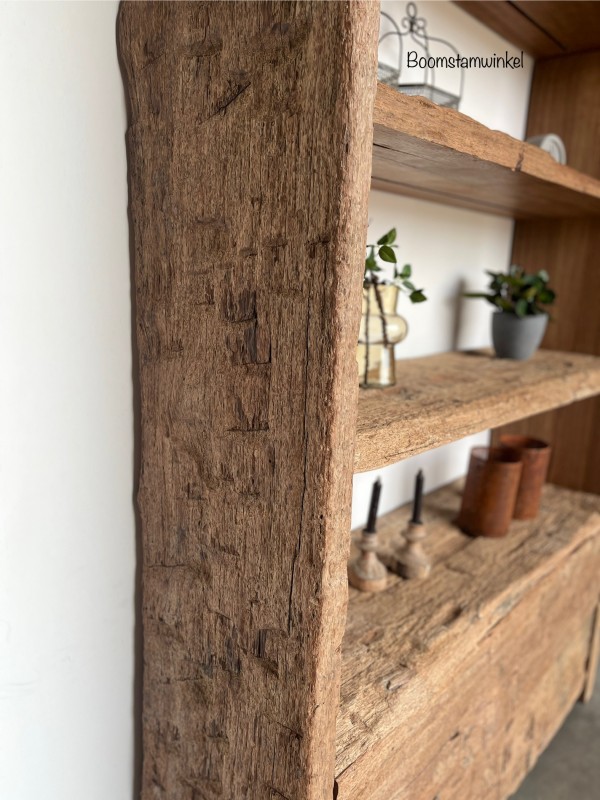 Deze stijlvolle kast is handgemaakt van oud hardhout en volledig uit hout opgebouwd – ook de zijkanten. In tegenstelling tot onze andere modellen met stalen frame, heeft deze kast een natuurlijke en warme uitstraling.