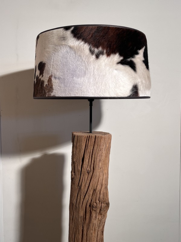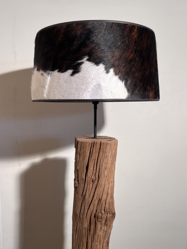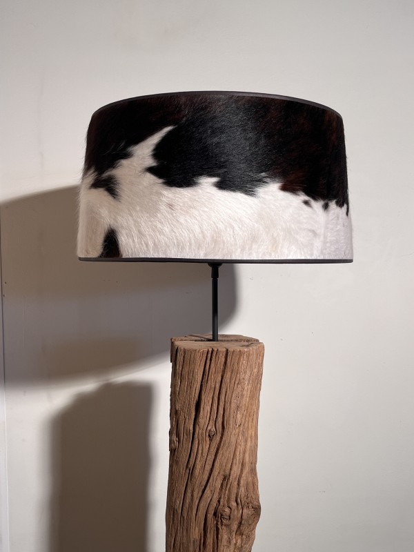Deze cilindervormige lampenkappen zijn gemaakt van koeienhuid en hebben een diameter van 55 cm, zowel aan de bovenkant als aan de onderkant gemeten. Ze zijn een prachtige toevoeging voor uw woonkamer. De prijs bedraagt € 175 euro per stuk.