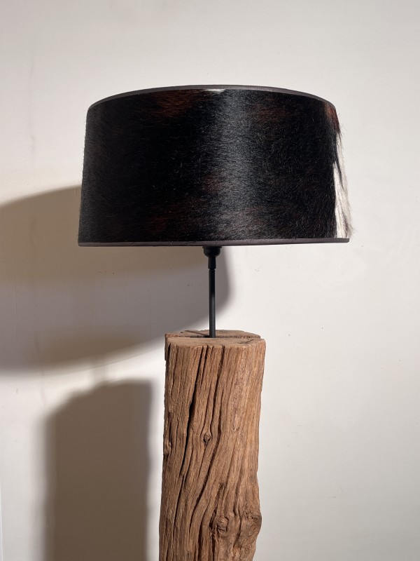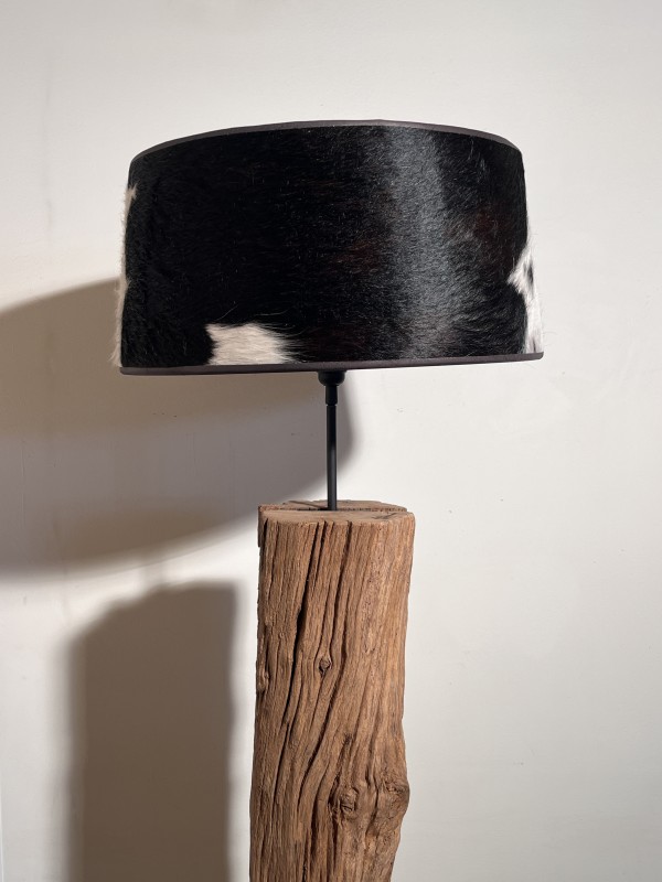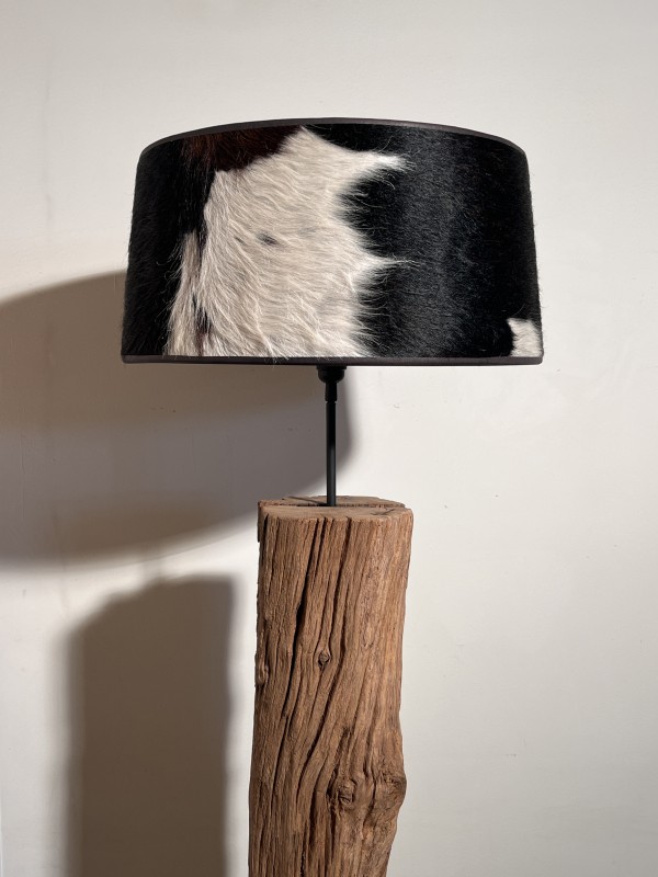 Dit is de lampenkap genaamd 'Anna'. Hij is vervaardigd uit koeienhuid en heeft een diameter van 50 cm aan de onderkant gemeten. De bovenrand van de lampenkap heeft een diameter van 45 cm. De totale hoogte van de lampenkap bedraagt 24 cm.