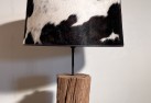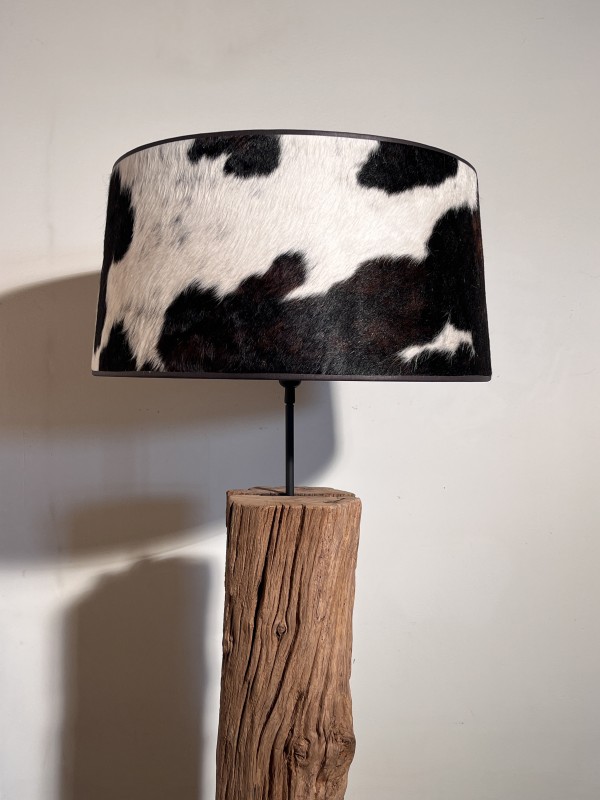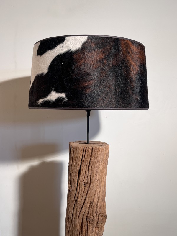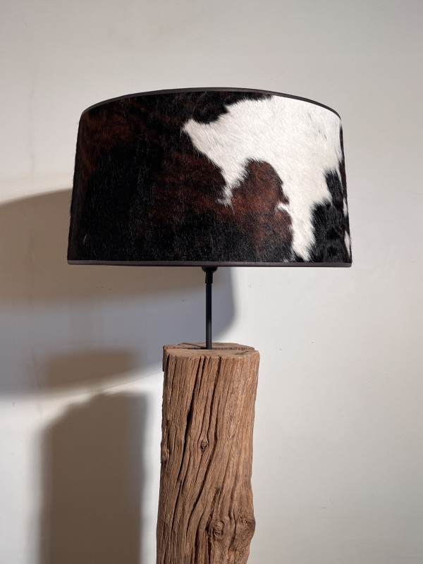 Dit is de lampenkap genaamd 'Corrie.' Hij is vervaardigd uit koeienhuid en heeft een diameter van 55 cm aan de onderkant gemeten. De bovenrand van de lampenkap heeft een diameter van 50 cm. De totale hoogte van de lampenkap bedraagt 28 cm.