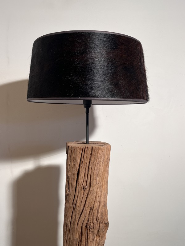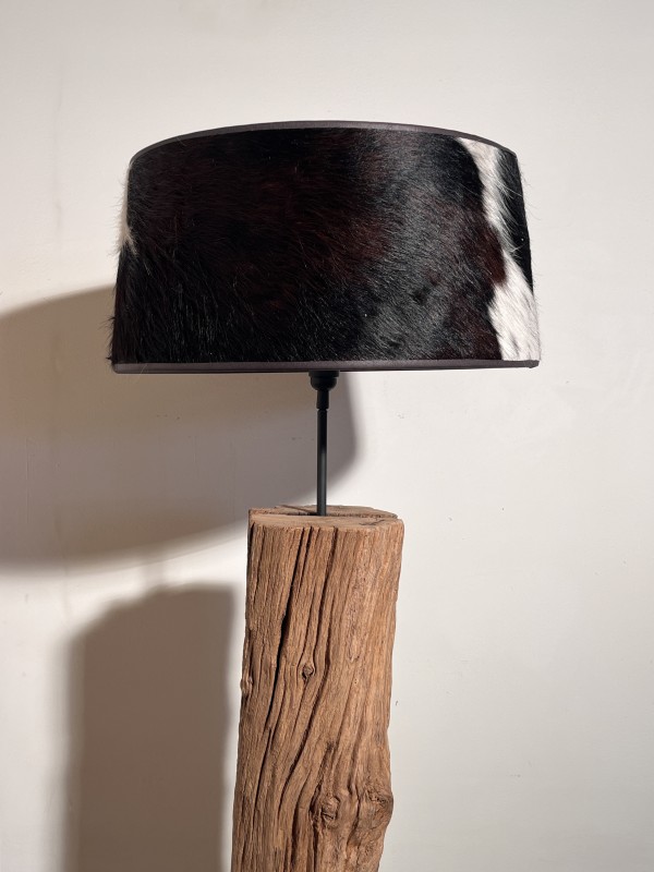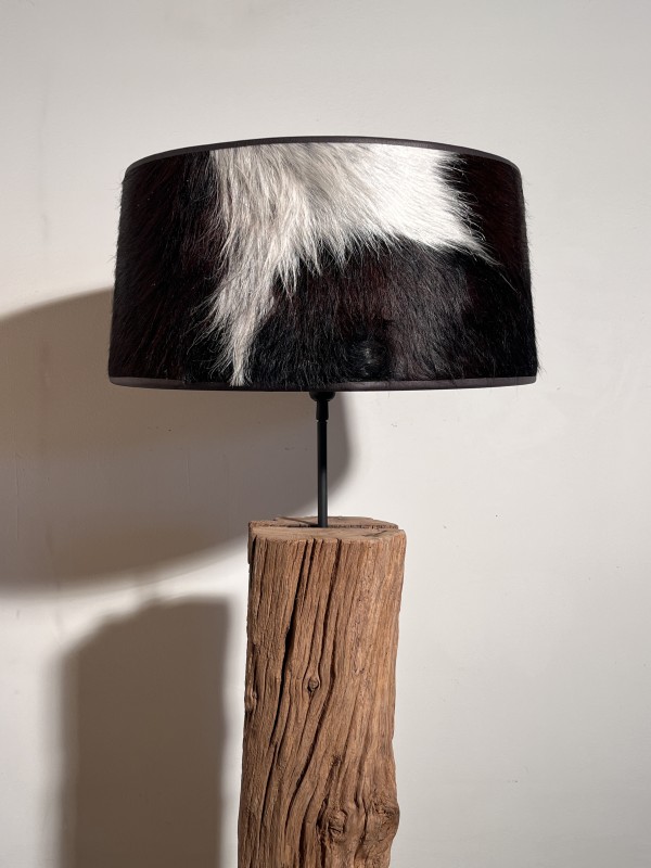 Dit is de lampenkap genaamd 'Leonora' Hij is vervaardigd uit koeienhuid en heeft een diameter van 50 cm aan de onderkant gemeten. De bovenrand van de lampenkap heeft een diameter van 45 cm. De totale hoogte van de lampenkap bedraagt 24 cm.