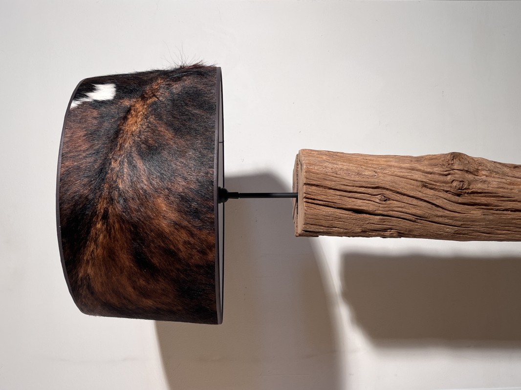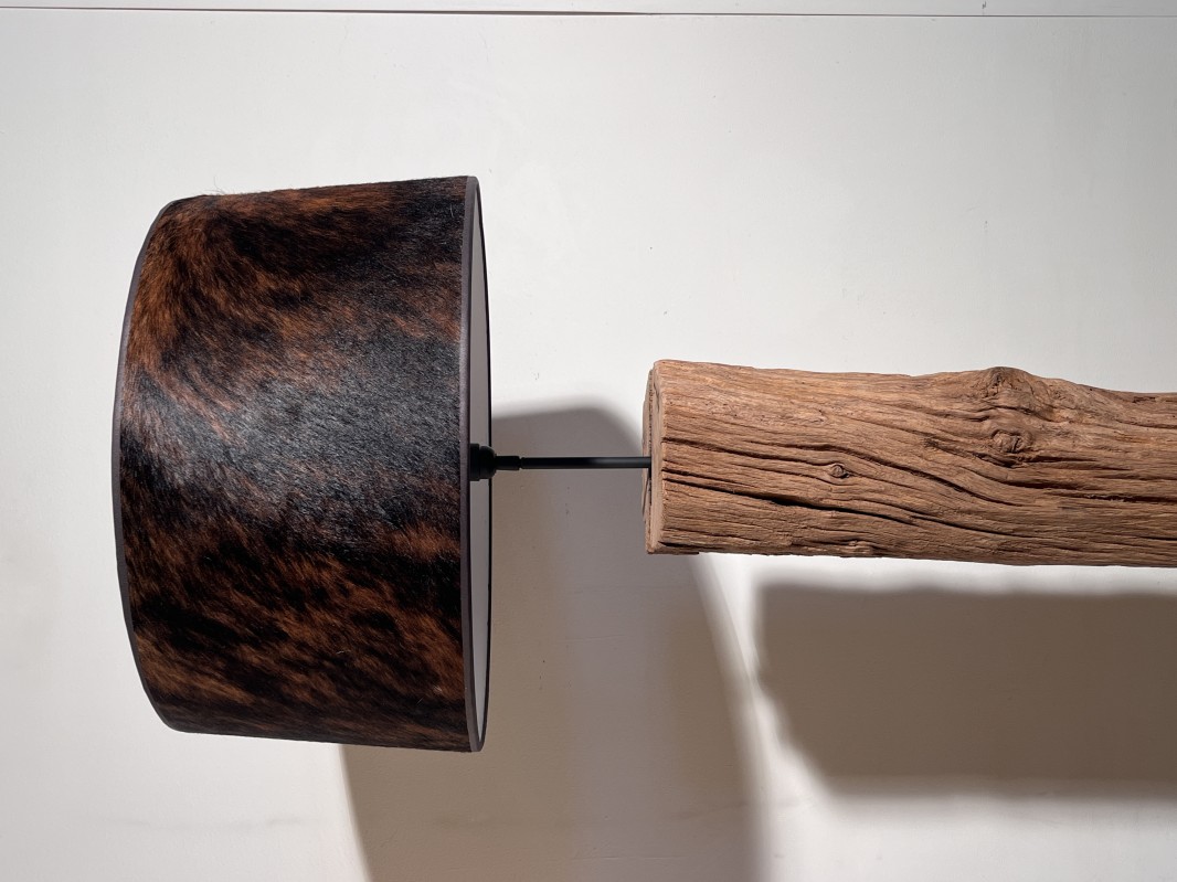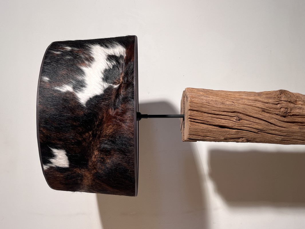 Lampenkap genaamd 'Cora'. De lampenkap is gemaakt van koeienhuid en heeft een doorsnee van 55 cm aan de onderkant gemeten. De bovenrand van de lampenkap heeft een diameter van 50 cm. De totale hoogte van de lampenkap is 28 cm.