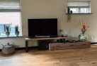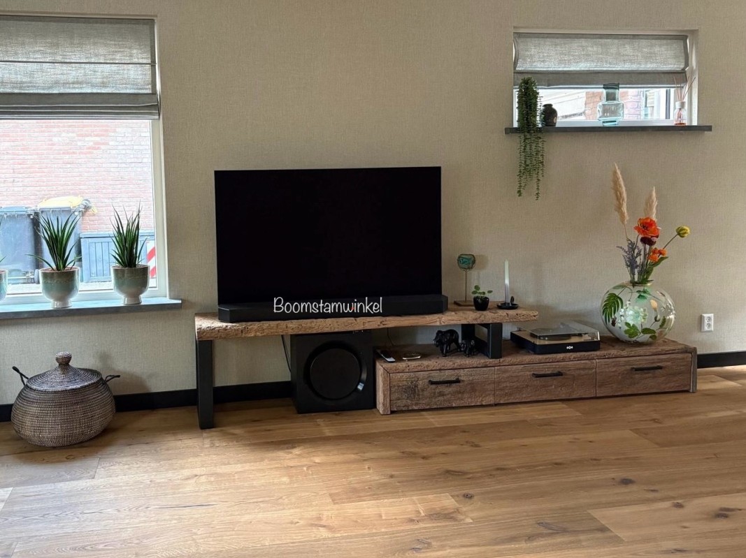 De houtdikte varieert van 3-5 cm, maar we bieden ook een robuustere optie met een houtdikte van 5-8 cm. Op de foto's ziet u een exemplaar van 200 cm, dat zelfs kan worden uitgeschoven tot 240 cm. Natuurlijk kunnen we dit tv-meubel ook op maat maken, zodat het perfect in uw ruimte past.