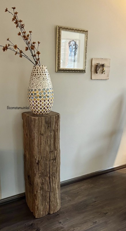 Een eyecather in uw interieur! Stoere sokkel van een meerpaal gemaakt. We maken de zuilen eerst goed schoon en borstelen daarna het hout. De boven en onderkant wordt vlak gemaakt zodat u verzekerd bent van een stevige zuil! Doorsnede ongeveer 27-30 cm.